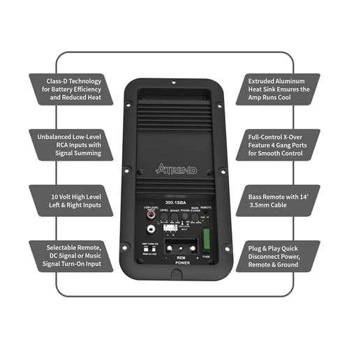 The ATrend 300.1SBA is an enclosed 336 watt RMS, Class D amplifier built into an air tight, impact resistant ABS enclosure with sealed subwoofer leads to prevent internal sub box air from leaking into and out of the amplifier.