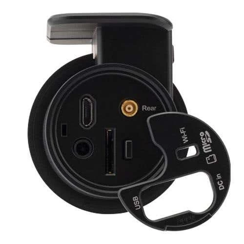 It replaces your dashcam’s original mount. The side cover, fastened by two hex screws, blocks the access to the microSD card and the cable connectors.