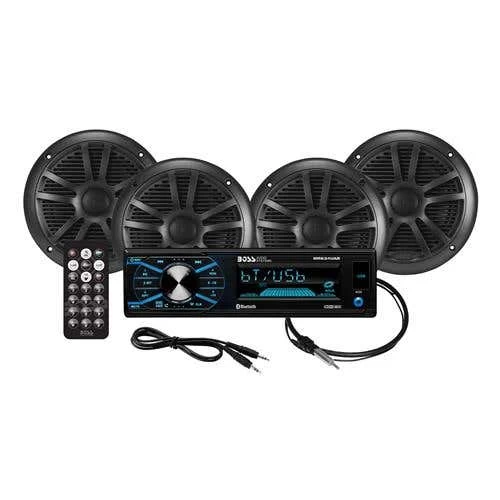 This Boss Marine receiver speaker package has MR634UAB, MR6B, MRANT10, 35AC, Single-DIN, MECH-LESS Multimedia Player (no CD/DVD) Detach Panel Bluetooth