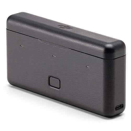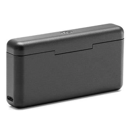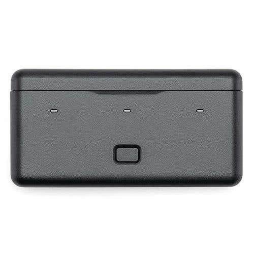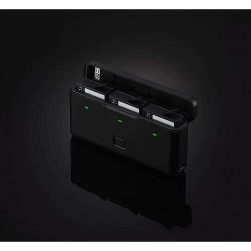 Stores three batteries and two microSD cards. Intelligently fast charges three batteries, and can be used together with those batteries as a power bank to charge other devices like a smartphone.