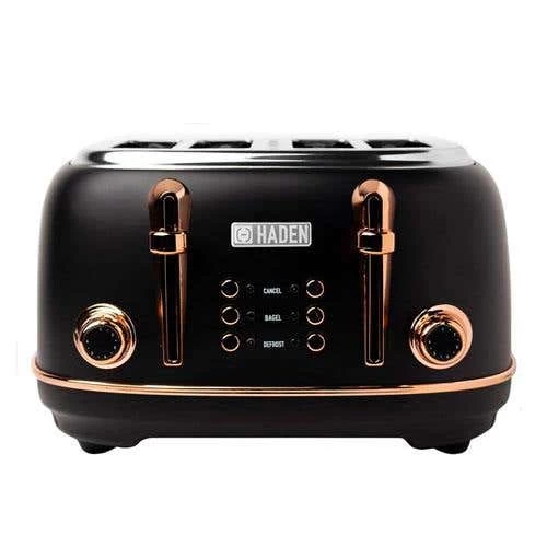 Brighten up your morning routine and upgrade your kitchen counter with the Haden Heritage 4 Slice Black & Copper Toaster. This retro-chic product features multiple settings to ensure that your toasts or bagels are browned exactly to your liking, this product has a cancel setting that lets you stop the toasting cycle midway. A self-centering function automatically centers bread for a perfect result.