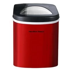 This Hamilton Beach freestanding portable ice maker makes 26 lbs. of ice per day. Never run to the store for a bag of ice again. Convenient, compact design is ideal for use in small kitchens and other compact spaces like RV’s, boats, dorm rooms and more. This portable ice maker requires no installation – just plug it in, add water and in less than 6 minutes you can enjoy fresh ice. The LED display and simple to use electronic controls makes operating your ice maker a breeze. Real red stainless steel cabinet will compliment any décor. Large see-through window allows you to see inside the ice maker without opening the lid.
