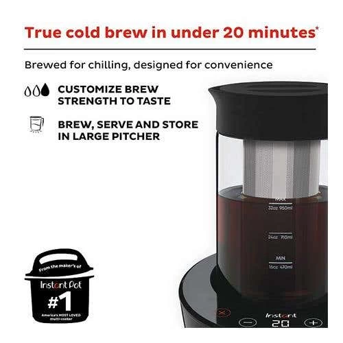 The Instant® Cold Brewer lets you make true cold brew at home, in under 20 minutes.* The unique FlashExtract™ technology produces cold brew without the heat and without the overnight wait. You can use your favorite ground coffee, and customize the brew strength go your own taste. If you’re an iced tea fan, you can use loose tea leaves to make delicious iced tea in minutes. The removable glass pitcher holds up to 32 oz for brewing, serving and storing, and is dishwasher safe for easy cleaning. Skip the line at the coffee shop and enjoy your own cold brew without leaving home.