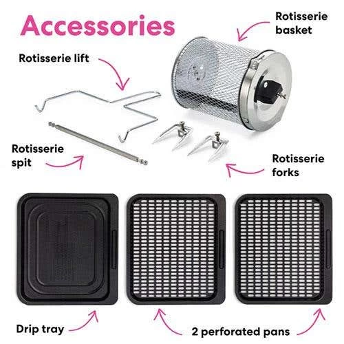 | Smart Programs | 7 Smart Programs Air Fry, Roast, Bake, Broil, Reheat, Dehydrate and Rotisserie cook |
