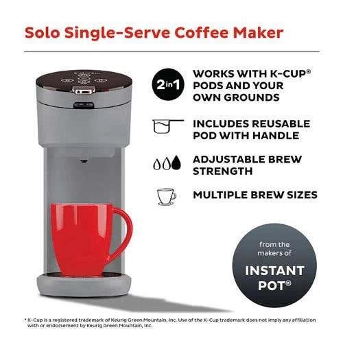 Kickstart your day with freshly brewed coffee. The Solo Single Serve Coffee maker is compatible with K-Cup® pods and your own ground coffee with the included reusable pod, so you can enjoy your favorite brew any time. The handy reusable pod lets you use your own coffee grounds, giving you unlimited choices every day. The adjustable brew strength lets you brew a bolder cup of coffee when you want it in your daily routine. This coffee maker is simple to operate, automatically selecting the optimum brew temperature and pressure, and easy to maintain with a large 40-ounce water reservoir and low-water and cleaning indicators.