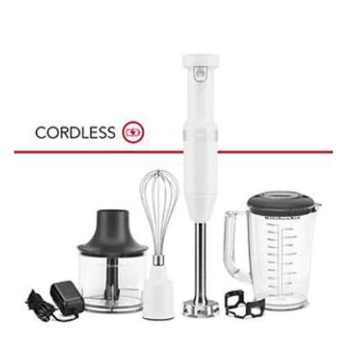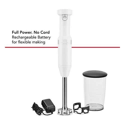 All the Power You Expect, without the Cord. Go where ambition takes you with the Cordless Hand Blender from KitchenAid. Designed with a powerful rechargeable Lithium Ion Battery, the new cordless hand blender delivers optimal run time and performance, so you can cook wherever*, whatever, and however you choose. Blends 25 bowls of soup on a full charge.** *Indoor use only. **Based on 12 ounce bowls (354 ml), 7 batches, Tomato Basil Soup.All the power you expect, without the cord.