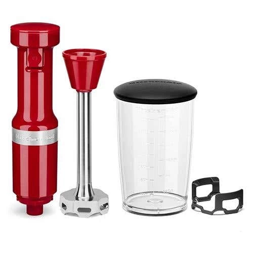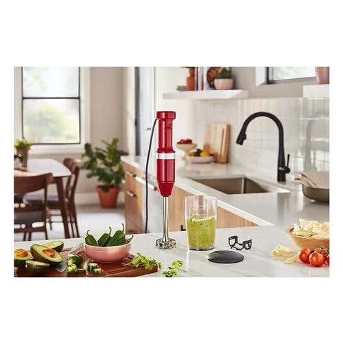 Designed for the perfect puree. This KitchenAid Variable Speed Corded Hander features an 8″ removable blending arm with 4-point stainless steel blade to blend everything from smoothies, to milk shakes, soups, sauces and so much more. It is easy to use with the variable speed trigger switch and includes a US patent-pending removal pan guard to help protect your cookware. The 3-Cup BPA-Free Blending Jar with lid is great for individual blending jobs, and can be used to serve direct from or to store your blended creation for a later use.
