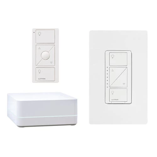 The Lutron Caséta Smart Bridge and free app makes it remarkably easy for you to set up, control and monitor Caséta Wireless dimmers and Serena Remote Controlled Shades from your iPhone, iPad or even your Apple Watch. This kit provides everything you need, including the Caséta Wireless Smart Bridge, Caséta Wireless in-wall light dimmers, and Pico remote controls. For maximum convenience the Caséta bridge also works with Apple HomeKit-enabled products, Nest, select Honeywell Thermostats, Logitech Harmony remotes and more.