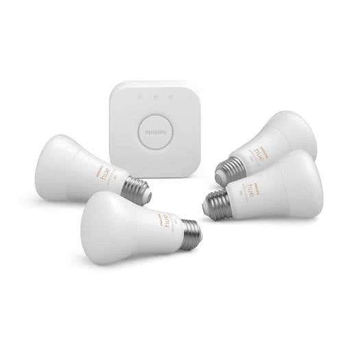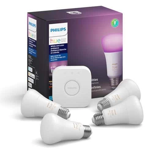 This Philips Hue Starter Kit includes four smart and energy-efficient A19 White and Colour Ambiance LED bulbs, and the Hue Bridge. They all work together to make your home smarter, comfortable and energy efficient.