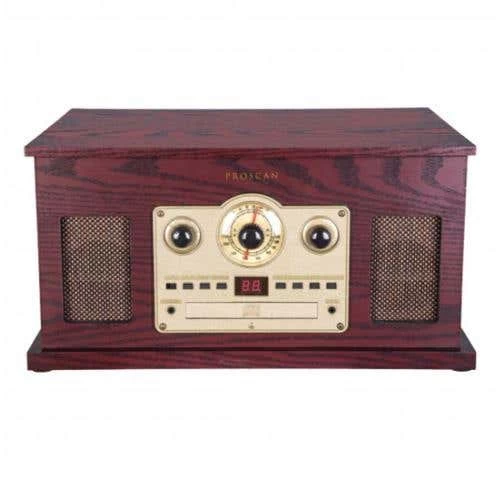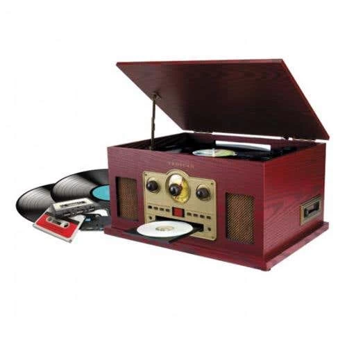 The Proscan Nostalgia 6-in-1 Entertainment System blends nostalgic styling with modern functionality. It can handle vinyl records, cassettes, and CDs as well as Bluetooth streaming, AM/FM radio, and devices hooked up to its aux input. The record player plays 1 record at a time. Just place the tone arm above the record where you wish to start and lower the lever. You don’t even have to worry about hooking up speakers because it comes with 2 built-in dynamic speakers. Just plug it in and enjoy!