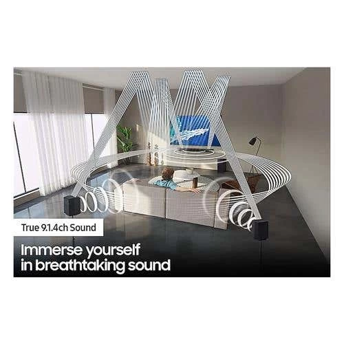 The soundbar’s 9 front and surround channels, 1 subwoofer channel, and 4 up-firing channels envelope you in sound. With newly added rear speakers, sound travels and reflects off of the ceiling to enhance your surround sound experience — a great match for your QLED TV.