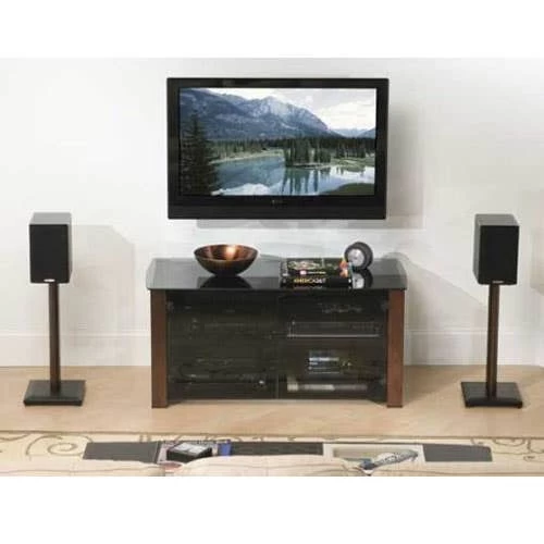 SANUS Natural Series NF24 is a 24-inch stand for medium bookshelf speakers up to 25 lbs. Its black-lacquered MDF base includes adjustable carpet spikes and screw-in polyester feet for stability. A solid hardwood pillar supports a 7.5 by 7.5-inch top plate with adjustable-height brass studs and neoprene pads to provide superior isolation and resonance damping for speakers. Patented wire management channel conceals and protects cables. This product is sold as a pair.