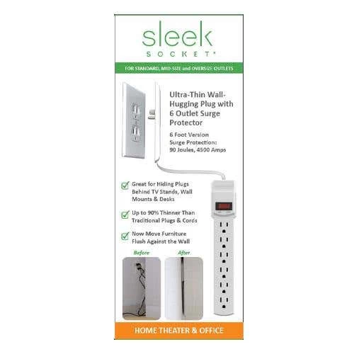 The Sleek Socket surge protector is great for Home Theaters, Home Offices, TV Stands and Entertainment Centers. It hides ugly and unsafe plugs and cords, all while allowing full use of covered outlets.