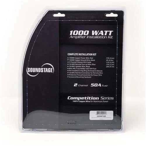 The Soundstage 100% Pure Copper Amplifier Installation Kit is 1,000 Watts with 2 Channels and 50A Fuse.